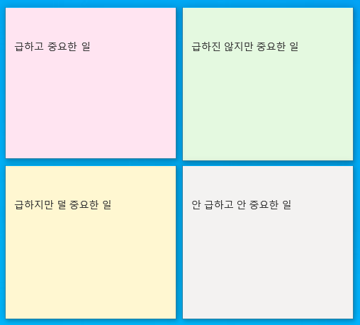 급하고 중요한 일/ 급하지만 덜 중요한 일/ 급하진 않지만 중요한 일/ 안 급하고 안 중요한 일