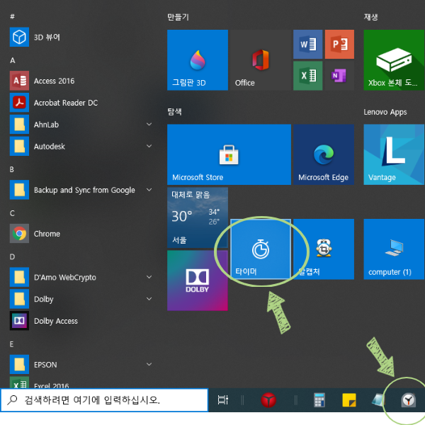 작업표시줄의 시작 버튼을 눌러 ㅇ으로 시작하는 부분에서 찾아볼 수 있고요.