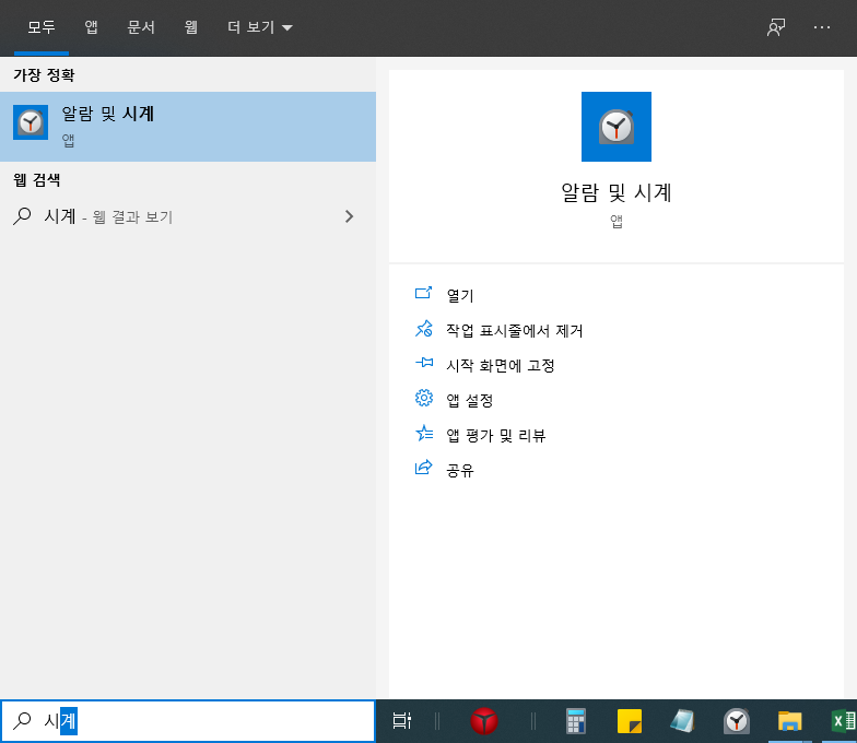작업 표시줄 검색창에서 '시계' 또는 '알람'을 검색하시면 쉽게 찾을 수 있답니다.